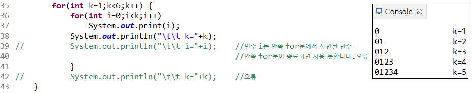 20라인 while문 내 지역변수 k는 while문 { } 블록 내에서만 사용할 수 있다.