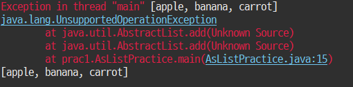 //list1.add("tomato"); 오류 java.lang.UnsupportedOperationException