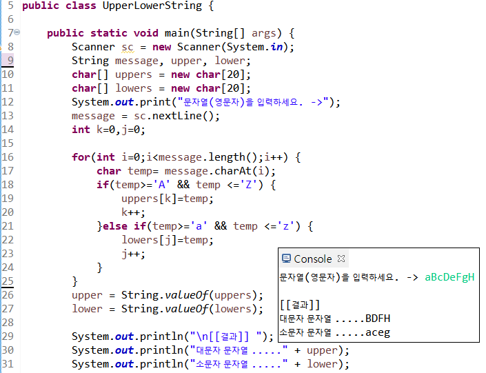 19라인 temp가 대문자라면 temp값을 uppers 배열 k번 인덱스에 저장한다.