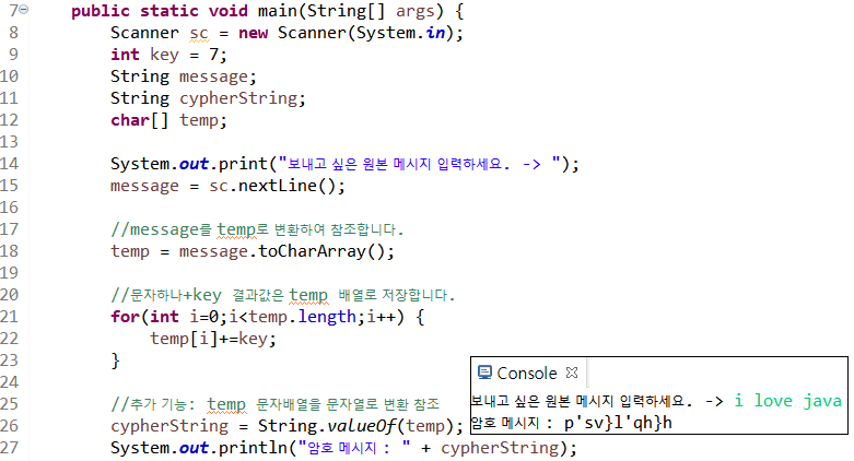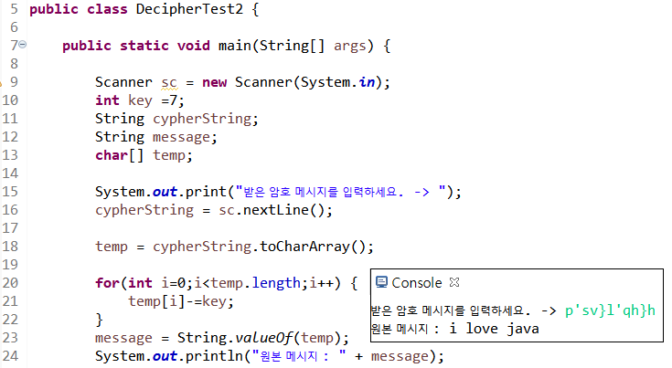 24라인 원본 메시지를 출력하면 p'sv}l'qh}h의 각 문자의 ascii코드에서 7을 뺀 i love java가 출력된다.