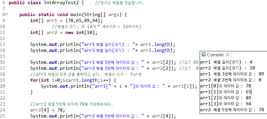 19라인 배열의 모든 값을 출력한다. for문의 조건식을 i<배열 길이로 하면 배열의 길이가 변경되어도 잘 실행될 수 있다.