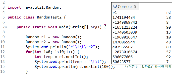 15라인 nextInt() 메소드에 인자 100을 대입하면 0~99 범위의 난수를 반환받는다.