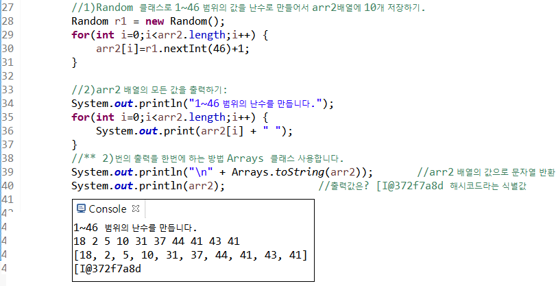 39라인 Arrays 클래스의 toString(배열) 메소드를 사용하면 배열의 값으로 문자열이 반환된다.